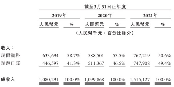 在2019至2021财年间,高端品牌“瑞尔齿科”营收占比正在逐年下降,中端品牌“瑞泰口腔”营收占比正在逐年上升。
