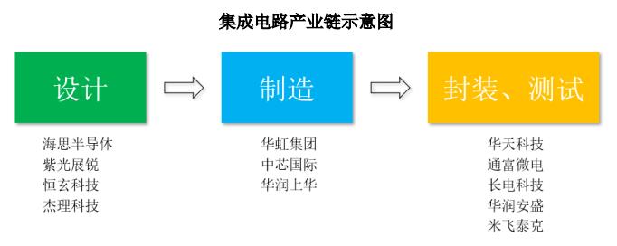 设计处于起始端,国内代表企业有海思半导体、紫光展锐、恒玄科技、杰里科技等;生产制造环节包括华虹集团、中芯国际、华润上华等;封装测试环节主要企业包括华天科技、通富微电、长电科技、华润安盛、米飞泰克等。