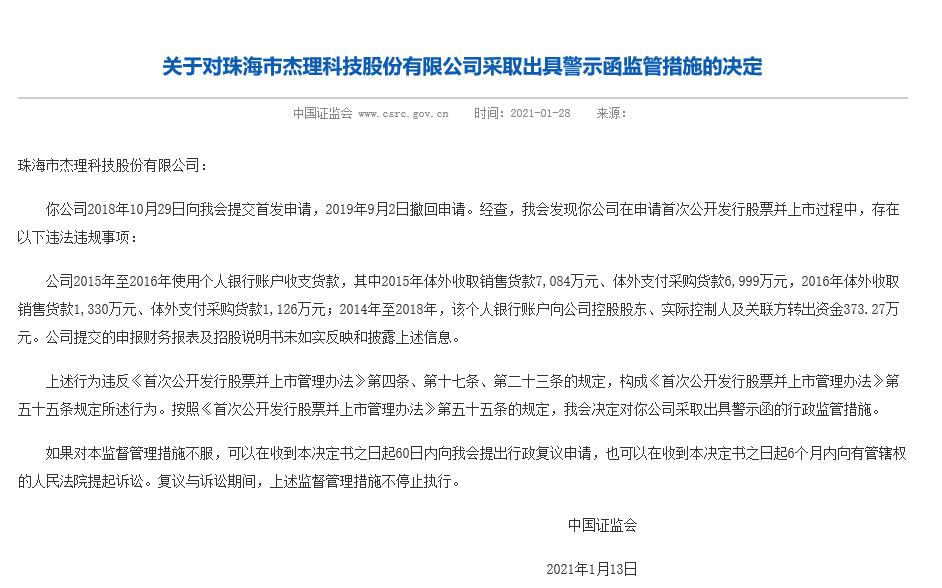 早在2017年~2018年之间,杰理科技曾先后两次向证交会递交IPO申请,欲在上交所主板上市,然后又两度撤回,甚至还收到了证监会的警示函,暴露出体外收取货款等内控问题。