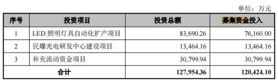 民爆光电原拟公开发行股票数量不超过2617.00万股,占公司发行后总股本的比例不低于25.00%。本次发行不涉及老股东公开发售股份。公司原拟募集资金12.04亿元,分别用于LED照明灯具自动化扩产项目、民爆光电研发中心建设项目、补充流动资金项目。