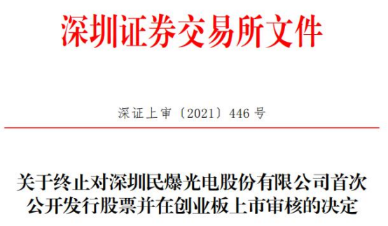 2021年9月28日,民爆光电向深交所提交了《深圳民爆光电股份有限公司关于撤回首次公开发行股票并在创业板上市申请文件的申请》,保荐人向深交所提交了《国信证券(11.820,0.00,0.00%)股份有限公司关于撤销保荐深圳民爆光电股份有限公司首次公开发行股票并在创业板上市的申请》。根据《深圳证券交易所创业板股票发行上市审核规则》第六十七条的有关规定,深交所决定终止对民爆光电首次公开发行股票并在创业板上市的审核。