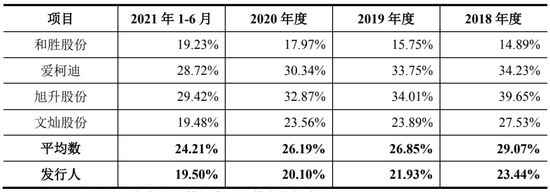 数据显示,2018年-2021年上半年,友升股份的毛利率分别为23.44%、21.93%、20.10%和19.50%,而同期同行业可比公司毛利率的平均值分别为29.07%、26.85%、26.19%和24.21%,友升股份一直低于行业平均值约5个点。