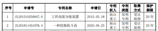 具体来看,申报稿显示,拓山重工发明专利共有2项,一是专利名称为“一种挖掘机斗齿”,申请日为2020年9月,申请号为“ZL201811451978.4”;二是专利名称为“工件高度分拣装置”,申请日为2015年5月,申请号为“ZL201510256847.0”。
