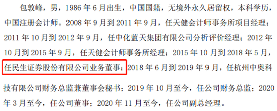 另外,包敦峰2018年6月到2019年9月任杭州中奥科技有限公司财务总监兼董事会秘书。2019年10月之后,包敦峰才进入拓山重工任财务总监。