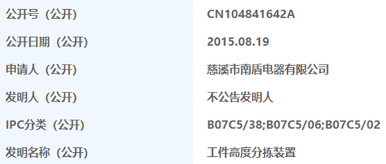 国家知识产权局还显示,拓山重工申请日为2015年5月的发明专利的申请人为慈溪市南盾电器有限公司(下称“南盾电器”),发明人则未公告。关于南盾电器,拓山重工申报稿也只字未提。另外,天眼查显示,南盾电器与拓山重工并无股权关系。即拓山重工这项发明专利可能从第三方买来的。
