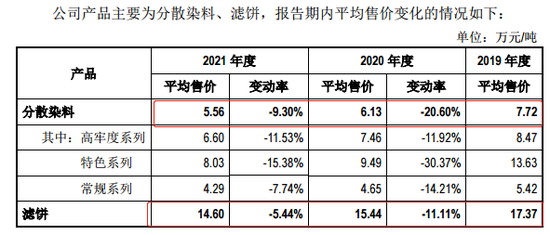 也因此,2019年万丰股份产品市场需求大幅提升。不过之后因行业内染料供给量增加,导致市场价格下降,2020-2021年万丰股份的分散染料及滤饼价格有所下降,分别从2019年的7.72万元/吨和17.37万元/吨下降至2021年的5.56万元/吨和14.6万元/吨。