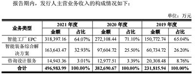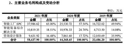 招股书显示,智能工厂EPC为机械九院第一大主营业务,报告期内营业收入分别为15.08亿元、27.21亿元和31.84亿元,分别占主营业务收入的65.04%、71.10%和64.07%。