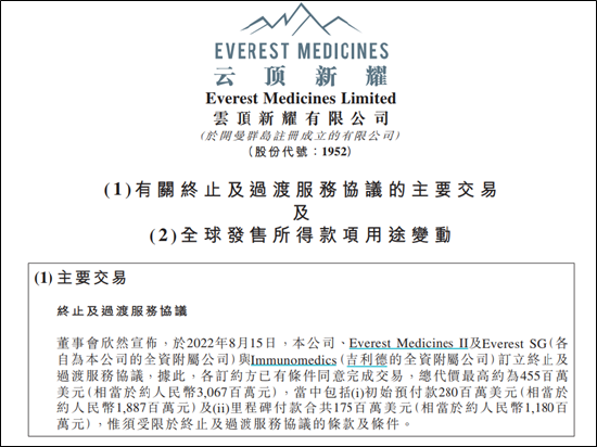 但根据该协议,出售Trodelvy后,云顶新耀将获得总额4.55亿美元的对价,其中包括预付款2.8亿美元和未来潜在的里程碑付款1.75亿美元。此外,云顶新耀将无需再支付2019年4月与Immunomedics签署的授权许可协议中的剩余高限里程碑付款7.1亿美元。