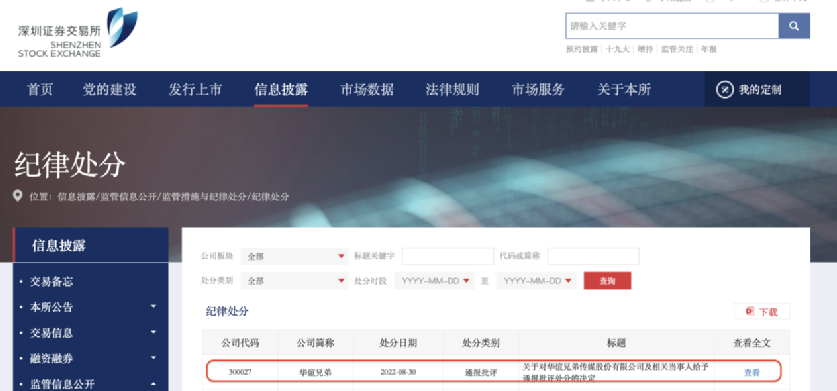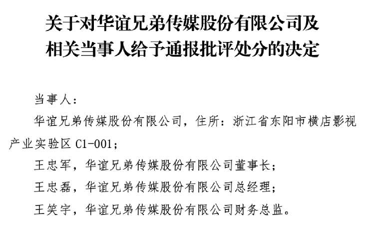8月30日,深交所对华谊兄弟及其董事长王忠军、总经理王忠磊、财务总监王笑宇给予通报批评的处分。