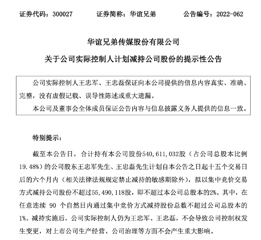 8月26日,华谊兄弟发布公告称,王忠军先生、王忠磊先生拟以集中竞价交易方式减持公司股份不超过55,490,118股,即不超过公司总股本的2%。