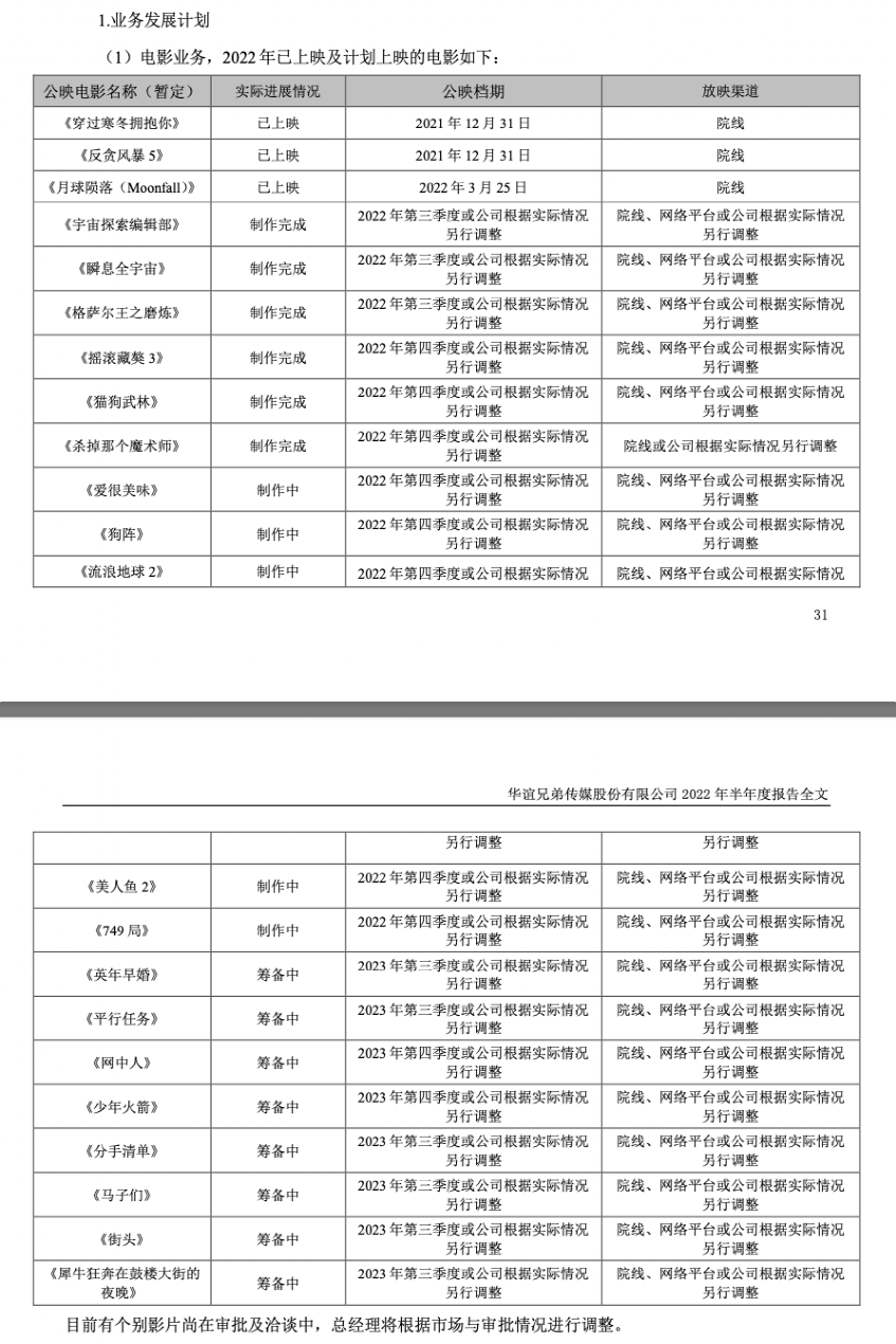 在半年报中,华谊兄弟还披露了部分电影的制作情况。共有6部电影制作完成,《流浪地球2》、《美人鱼2》等13部电影正在制作中。