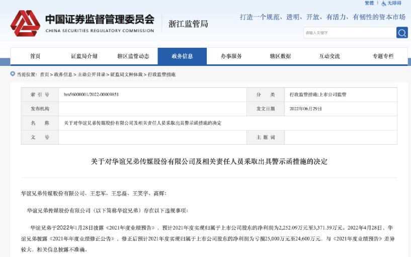 6月21日,浙江证监局对华谊兄弟传媒股份有限公司及相关责任人员出具了警示函。公告点名了华谊兄弟2021年业绩预告中的盈利情况与实际盈利情况不符。