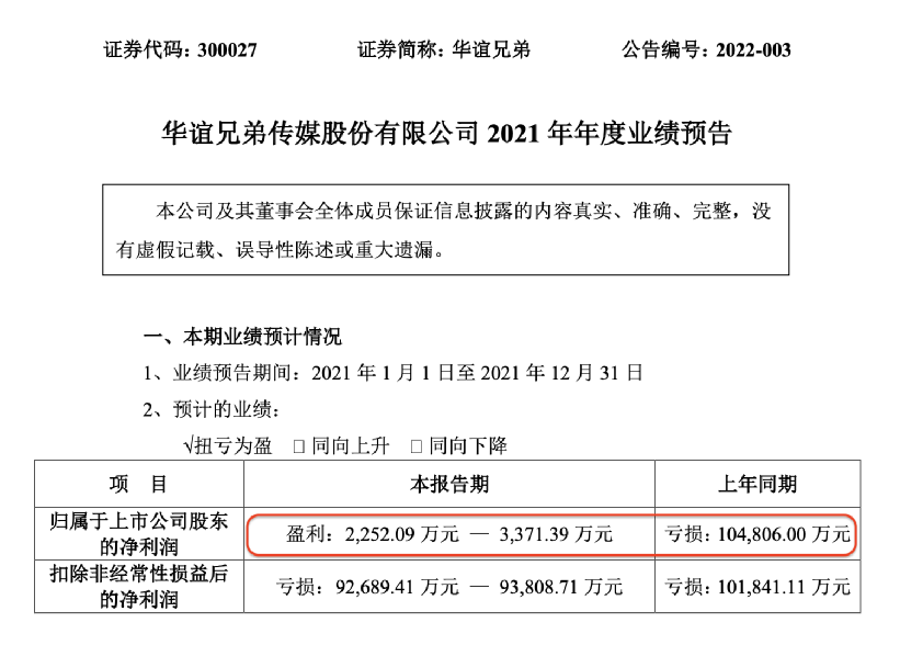 2022年1月28日,华谊兄弟披露的《2021年年度业绩预告》显示,预计2021年度归属于上市公司股东的净利润为2,252.09万元至3,371.39万元;4月28日,华谊兄弟披露《2021年年度报告》,经审计净利润为亏损24,624.34 万元。