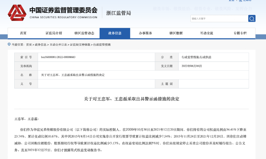 2022年5月31日,浙江证监局对华谊兄弟实控人王忠军、王忠磊出具警示函。公告显示,在2009年10月30日至2021年12月20日期间,二者持有的公司权益比例由34.41%下降至23.74%,累计变动比例10.67%。