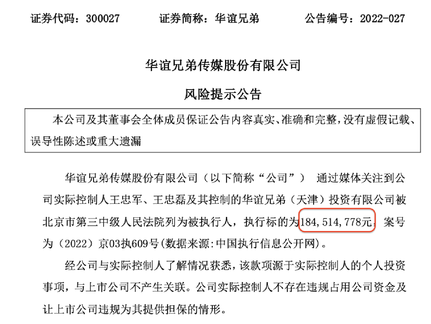 2022年4月28日,即公布2021年年报同日,华谊兄弟发布风险提示公告,称公司实际控制人王忠军、王忠磊及其控制的华谊兄弟(天津)投资有限公司被北京市第三中级人民法院列为被执行人,执行标的为1.85亿元。
