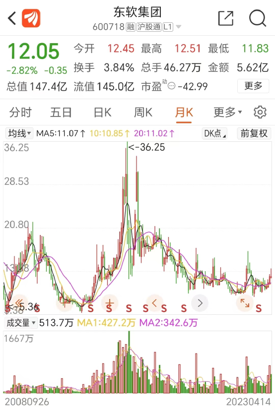2023年4月14日,东软集团股价以12.05元报收,相对于2015年6月的历史最高点,已跌去2/3;目前总市值为147亿元。
