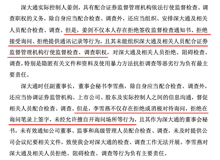期间公司及相关人员存在拒绝签收监督检查、调查通知书,拒绝检查、调查人员进入办公场所,拒绝接受询问并强行闯入询问场所阻断询问,强行带离正在接受询问的人员,辱骂、威胁检查、调查人员等拒绝、阻碍检查、调查的行为。