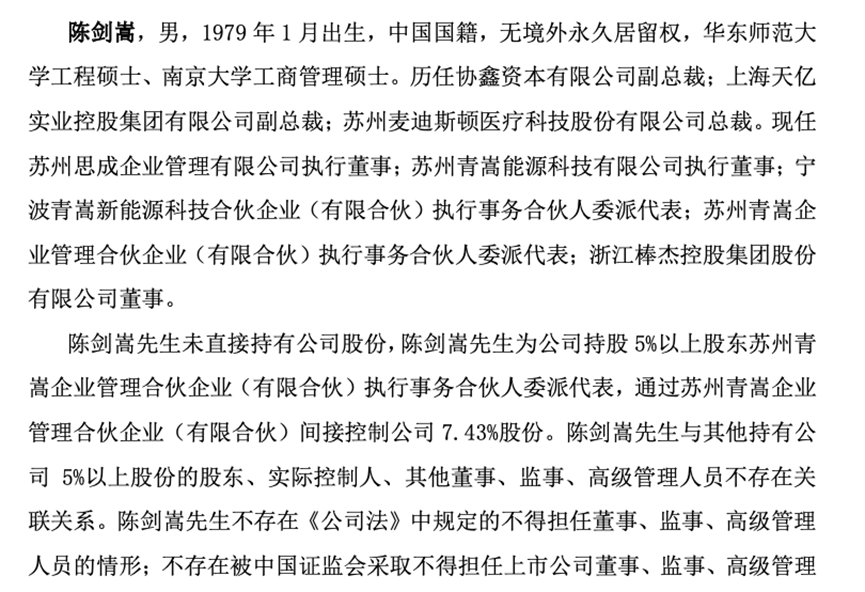 陶建伟辞任后,陈剑嵩接任董事长。公告显示,陈剑嵩系棒杰股份持股5%以上股东苏州青嵩企业管理合伙企业(有限合伙)执行事务合伙人委派代表,并通过苏州青嵩间接控制公司7.43%股份。