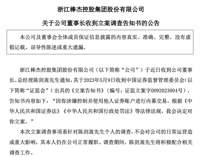 5月10日晚,棒杰股份(002634)公告,公司董事长因涉嫌控制并使用他人证券账户进行内幕交易,被证监会立案调查。